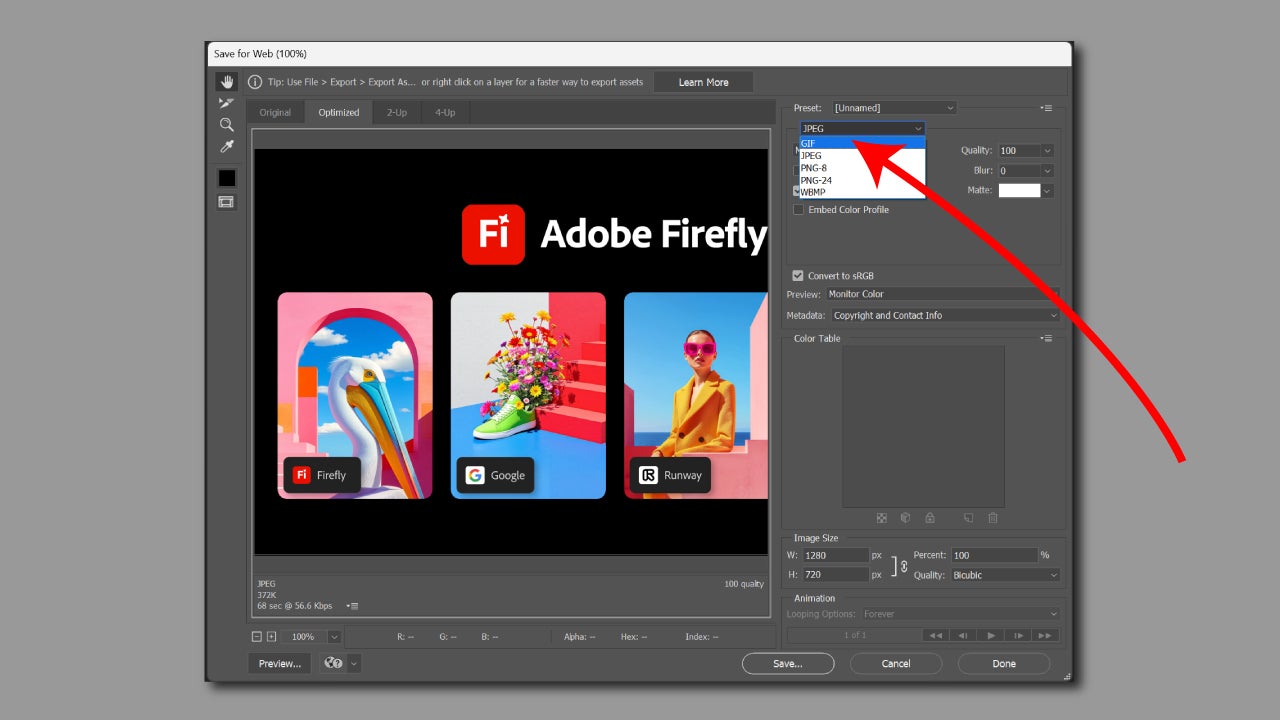 - Finally, export it from File > Export > Save for Web. Here, don’t forget to choose GIF as the format. Click on Save to save your GIF, and we would be done.