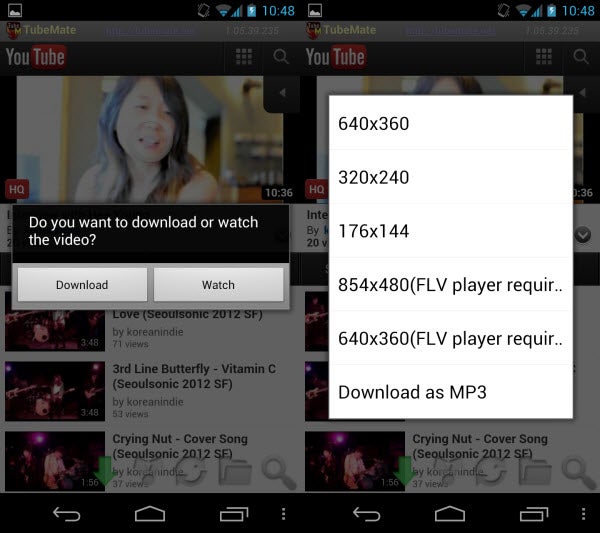 TubeMate YouTube Downloader accesses YouTube as an overlay. When selecting a video, you are given the choice to download or watch a video. Since you’re here to download videos, click on the green arrow on the bottom of the screen.
