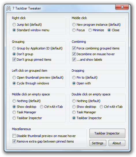 For those of you who want to go a step ahead, you can use a tweaker – that is, an advanced utility that enables you to modify system settings very easily. In the case of the Windows taskbar, we have 7 Taskbar Tweaker: a tool that has been specifically designed to customize every single detail in your taskbar, from the behavior of mouse clicks to the criteria followed to group buttons on the taskbar.