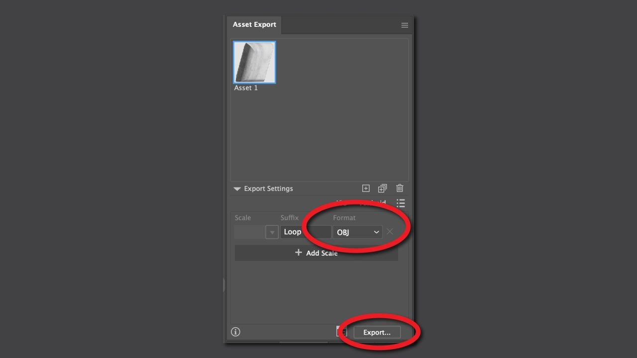 - Once you have chosen the format, select the object again in the Asset Export panel and click on Export.. to finish.