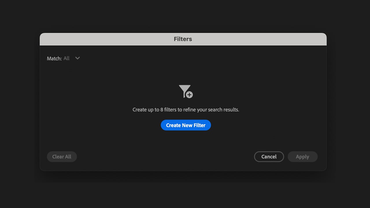 You also have an advanced filter available within the Search panel to further refine your searches. As Adobe itself explains, these searches apply metadata-based filters. Very useful for finding specific clips within a large-scale project. To use them, do the following:
