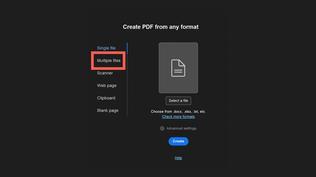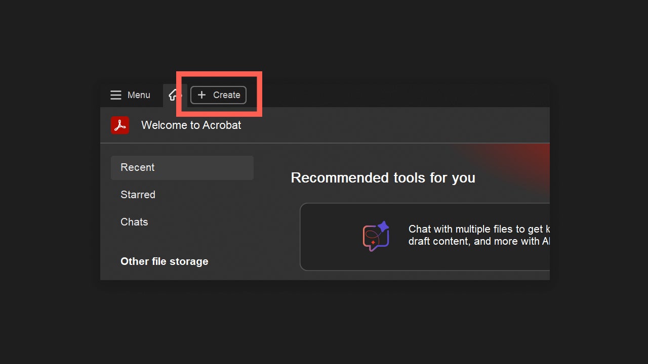 To merge several files into a PDF, open Adobe Acrobat, and in the top tabs, click on + Create.