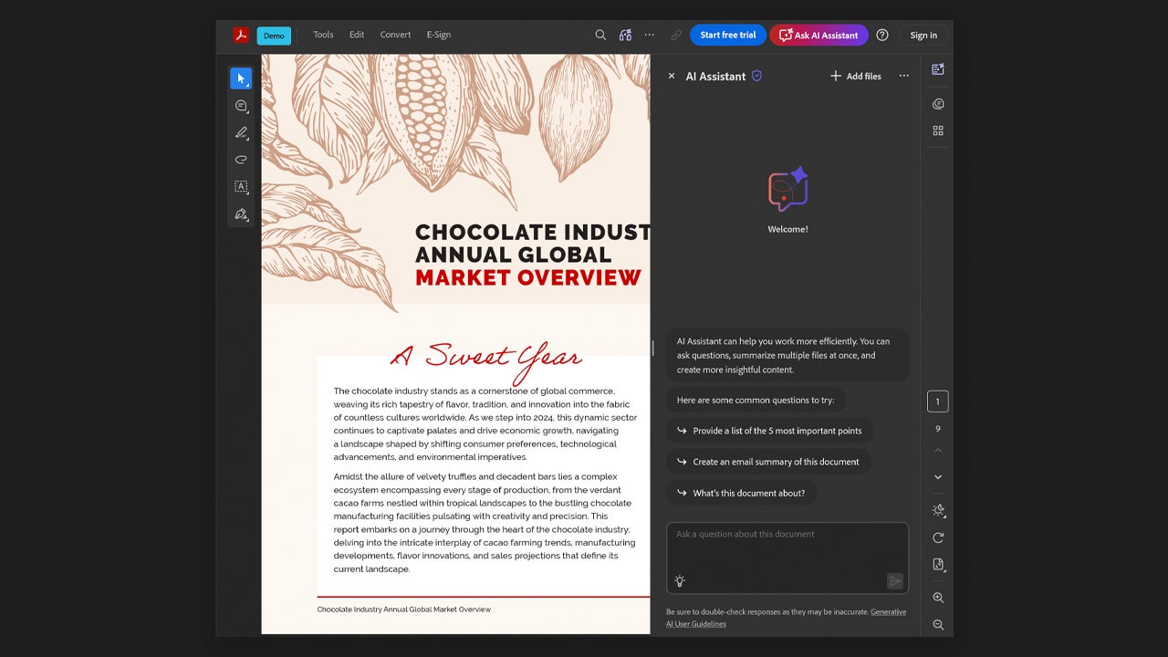 You can ask the Acrobat AI Assistant to summarize a document or to explain what it contains exactly. Very useful for lengthy contracts or receipts that use complex language, for example. To use it, open a document with Acrobat and select the Ask AI Assistant option (you will see it at the top right). Then, a chat will appear from where you can make your inquiries.