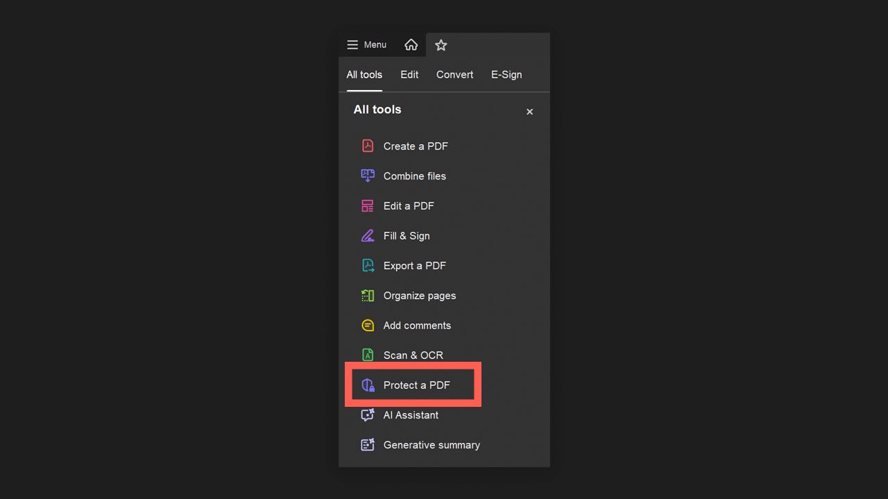If you want to password-protect your documents, you can easily do it this way. Open the document you want to protect with Adobe Acrobat. On the left, you will see the All Tools section. From there, look for the Protect a PDF option and click on it.
