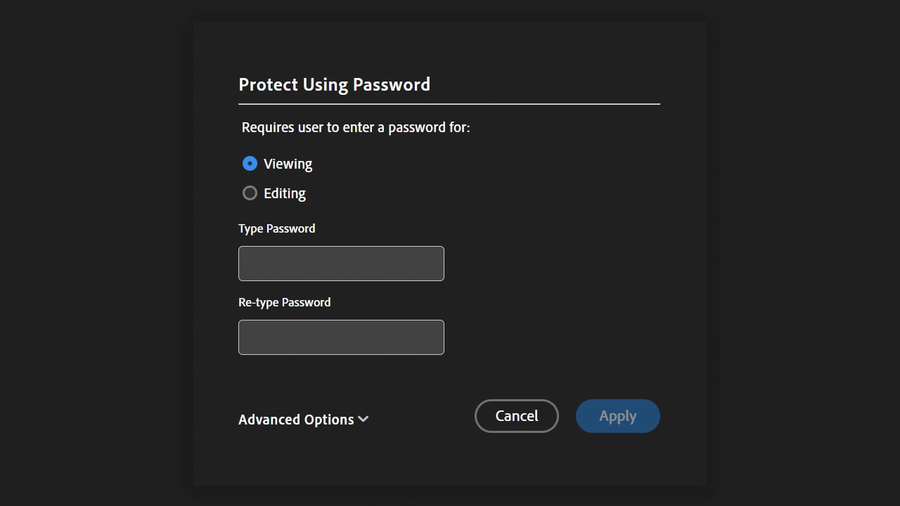 Below you will see a list of options to choose from on how you would like to protect your document. There are various degrees of complexity, from the simplest, such as password protection, to encryption with a certificate. If you select the Protect with Password option, you will then need to enter the password that will protect the document and choose whether the password allows editing or just viewing the document.