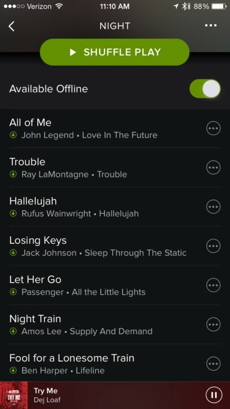 The solution is simple. On each playlist, or album name there is a toggle which you can switch to “Available Offline”. This basically downloads the album or playlist so you don’t have to be connected to the internet (it’s also very handy when you’re traveling, or have a weak signal).