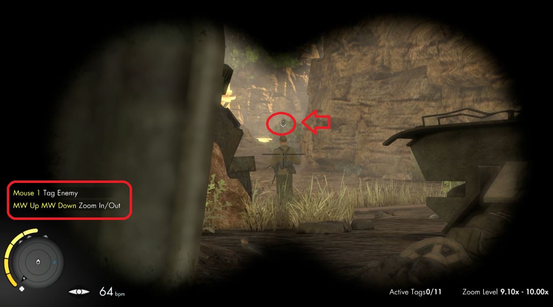 You’ll spend most of the game peering through the scope of your sniper rifle, and novice players may be frustrated that the cross-hairs don’t always guarantee 100% accuracy. Sniper Elite is a more realistic game, meaning that bullets are noisy and affected by things like distance, wind, and travel speed. As such you’ll need to take these factors into consideration before taking your shot. The best tip is to hold your breath (press ‘E’ to steady your shot) and wait for the red reticle to retract for maximum accuracy.