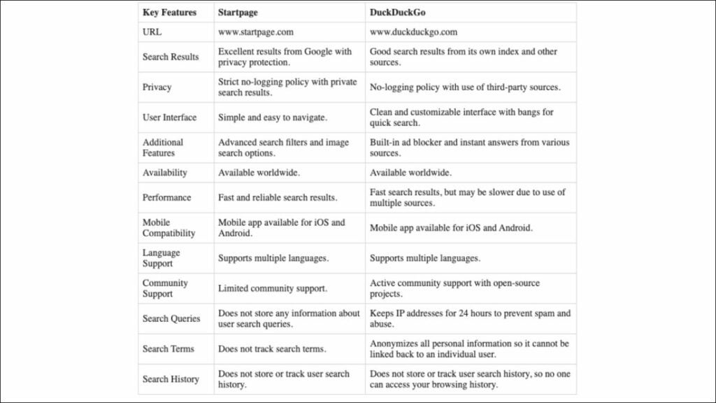 When comparing Startpage app vs DuckDuckGo, it’s important to consider their key features. Both prioritize user privacy and offer similar features, however, there are a few key differences to note.
