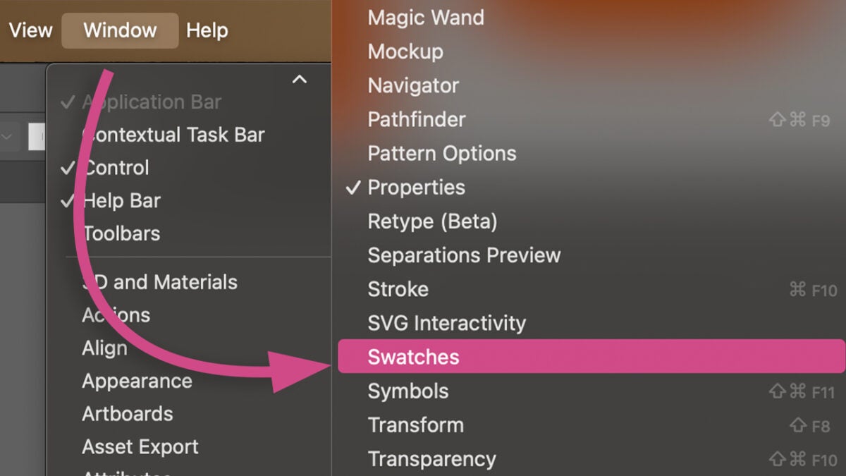 - First, we will open the Swatches Panel. You will need to go to Window > Swatches.