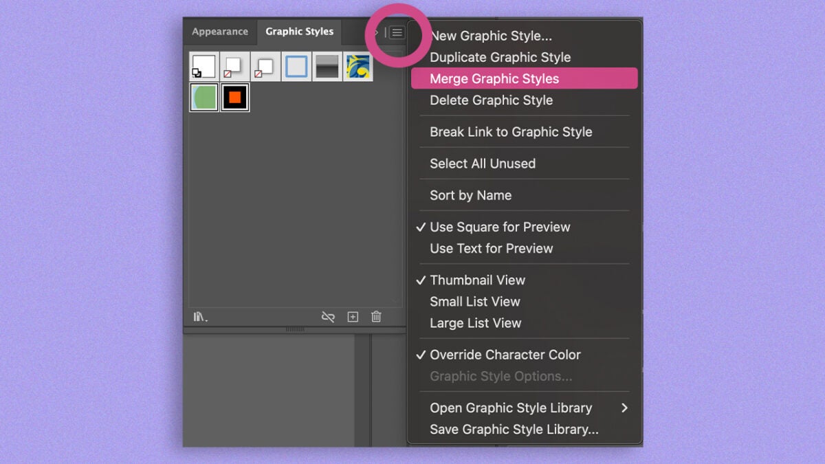 Illustrator also allows you to combine existing graphic styles. To do this, select the Merge Graphic Styles option, which you will find under the symbol of the three horizontal lines.