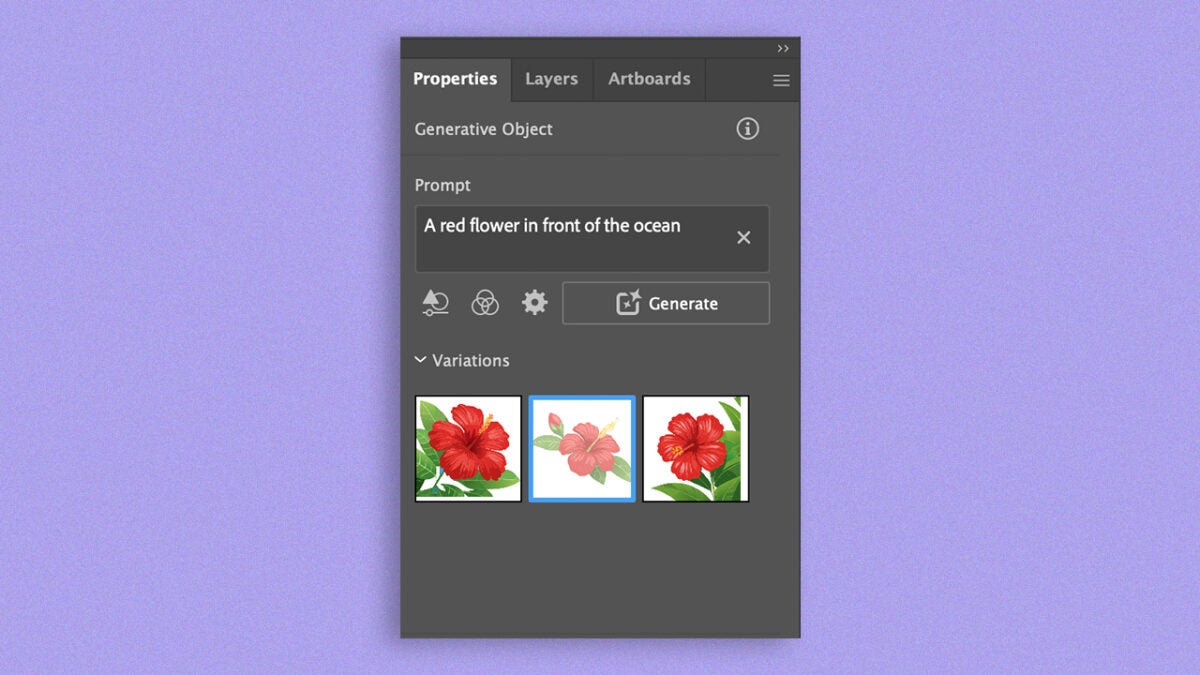- Adobe will provide several results based on your request. Choose the one you like the most or continue refining with your description. You will find all this information under the Properties panel.