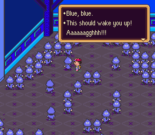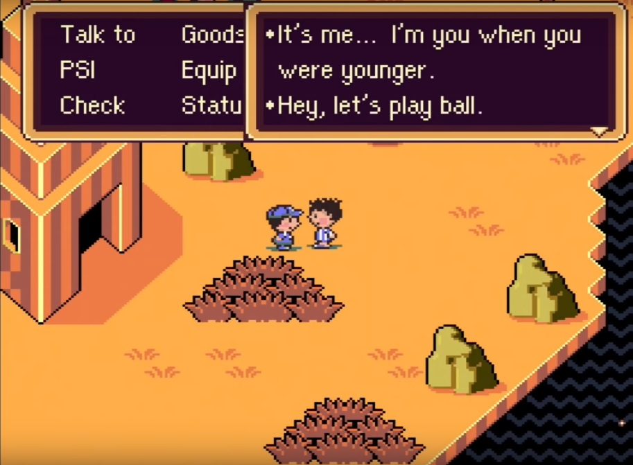 Toward the end of the game, Ness is knocked unconscious and enters a place called Magicant. Magicant is easily the most cerebral and introspective part of the game. It is Ness’ own subconscious, filled with little snippets of your adventure and Ness’ past, such as a snowman that Ness once made as a child that eventually melted away. You encounter both enemies and allies while exploring, and some enemies even comment on how much it hurt when you killed them. The most startling person that pops up in Magicant is Ness’ younger self. When spoken to, young Ness says this: