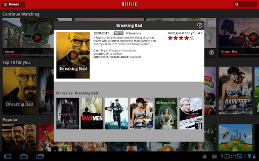Netflix is revolutionizing the way people consume movies and TV shows. You pay a monthly fee and can then access as many TV episodes and movies as you can handle whenever you like. The Netflix app is optimized for Android tablets and makes it easy to search for and watch movies on your device. One of the great features of Netflix is that you can watch on your tablet, then automatically resume playing from the point you got to on another device. Price: Free (subscription required to rent)