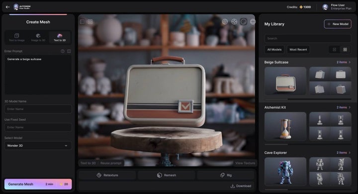 Wonder 3D’s Text to 3D feature is as intuitive as the rest of Autodesk’s generative AI functions. We describe a character, a creature, or a prop, and Flow Studio generates an editable 3D asset with geometry and texture for us.